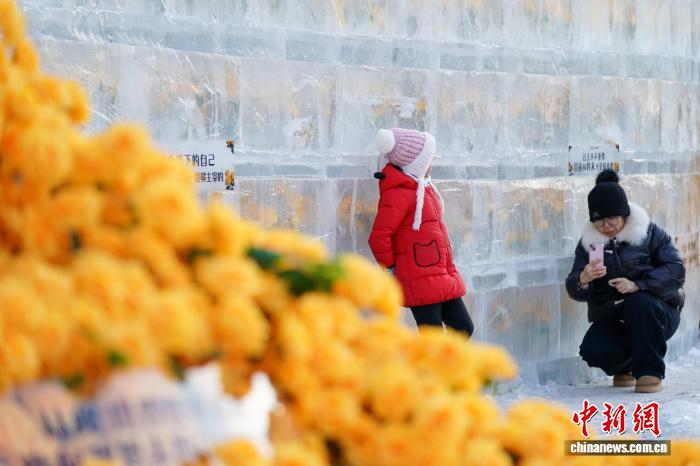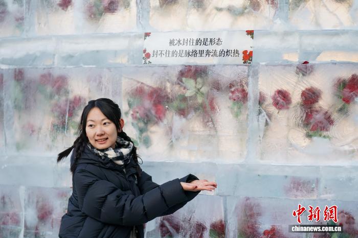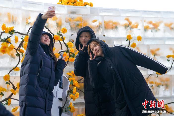 12月21日,乌龙江哈我滨,游人挨卡“冰启玫瑰”。中新社记者 赵宇航 摄